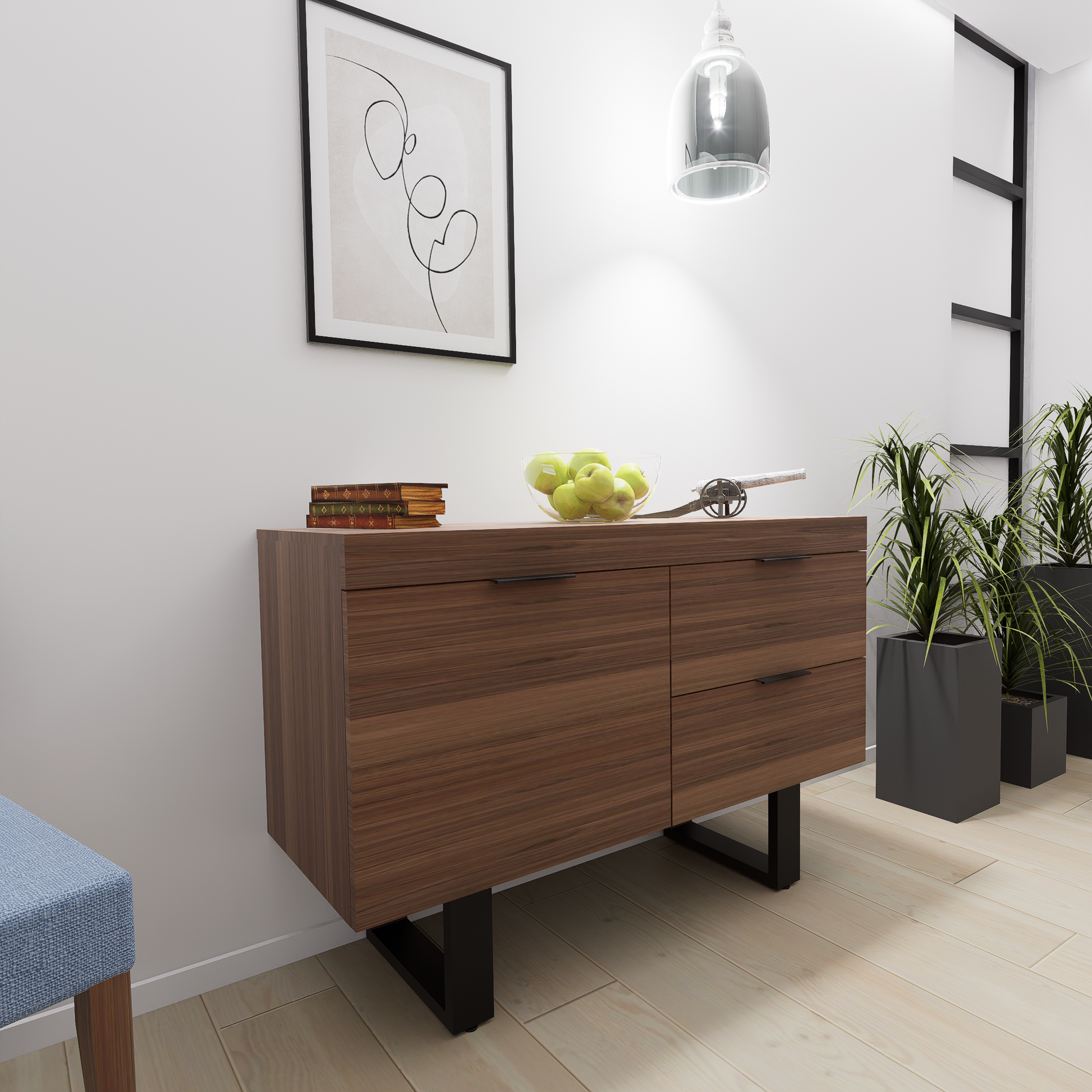 Le buffet Gaspé peut être fabriqué entièrement en BOIS MASSIF (au choix : érable ou noyer) ou en PLACAGE DE BOIS (noyer, merisier ou chêne). Les pattes du meuble sont en ACIER.