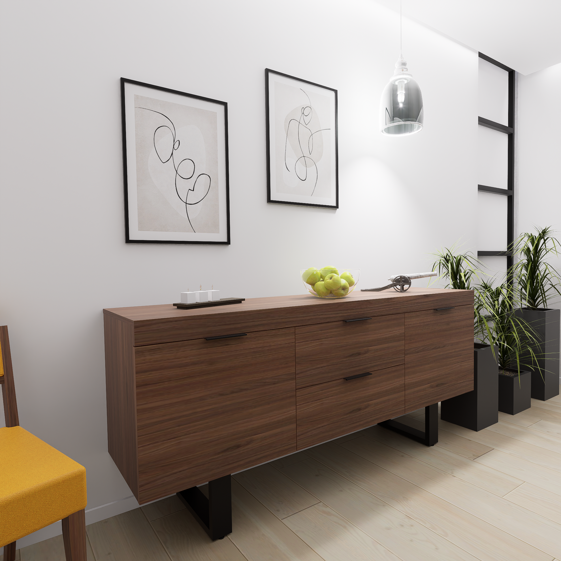Le buffet Gaspé peut être fabriqué entièrement en BOIS MASSIF (au choix : érable ou noyer) ou en PLACAGE DE BOIS (noyer, merisier ou chêne). Les pattes du meuble sont en ACIER.