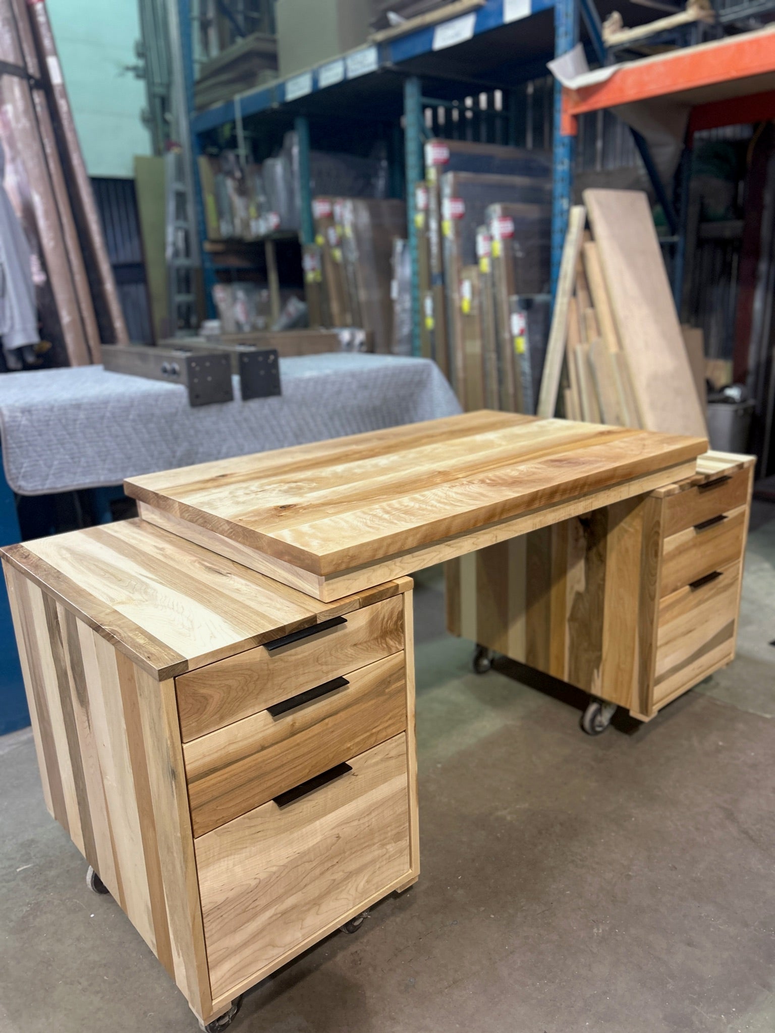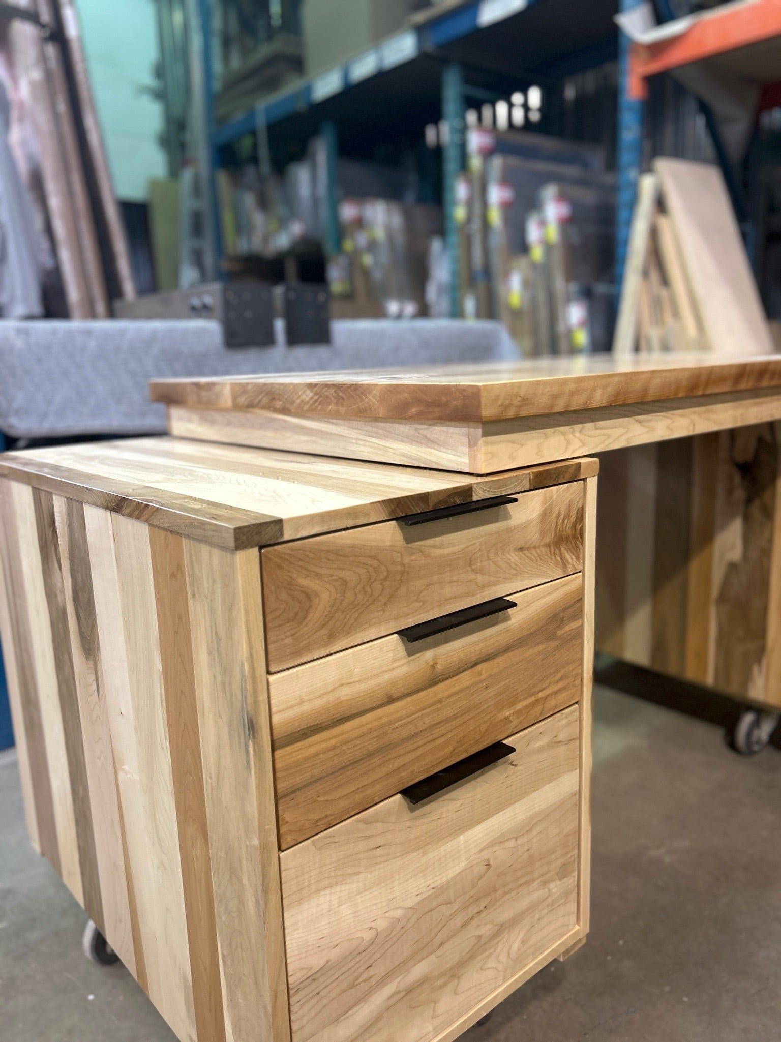 Le bureau de travail Orford peut être fabriqué entièrement en BOIS MASSIF (au choix : érable ou noyer) ou en PLACAGE DE BOIS (noyer, merisier ou chêne). Les pattes du bureau (si applicable) sont en acier.