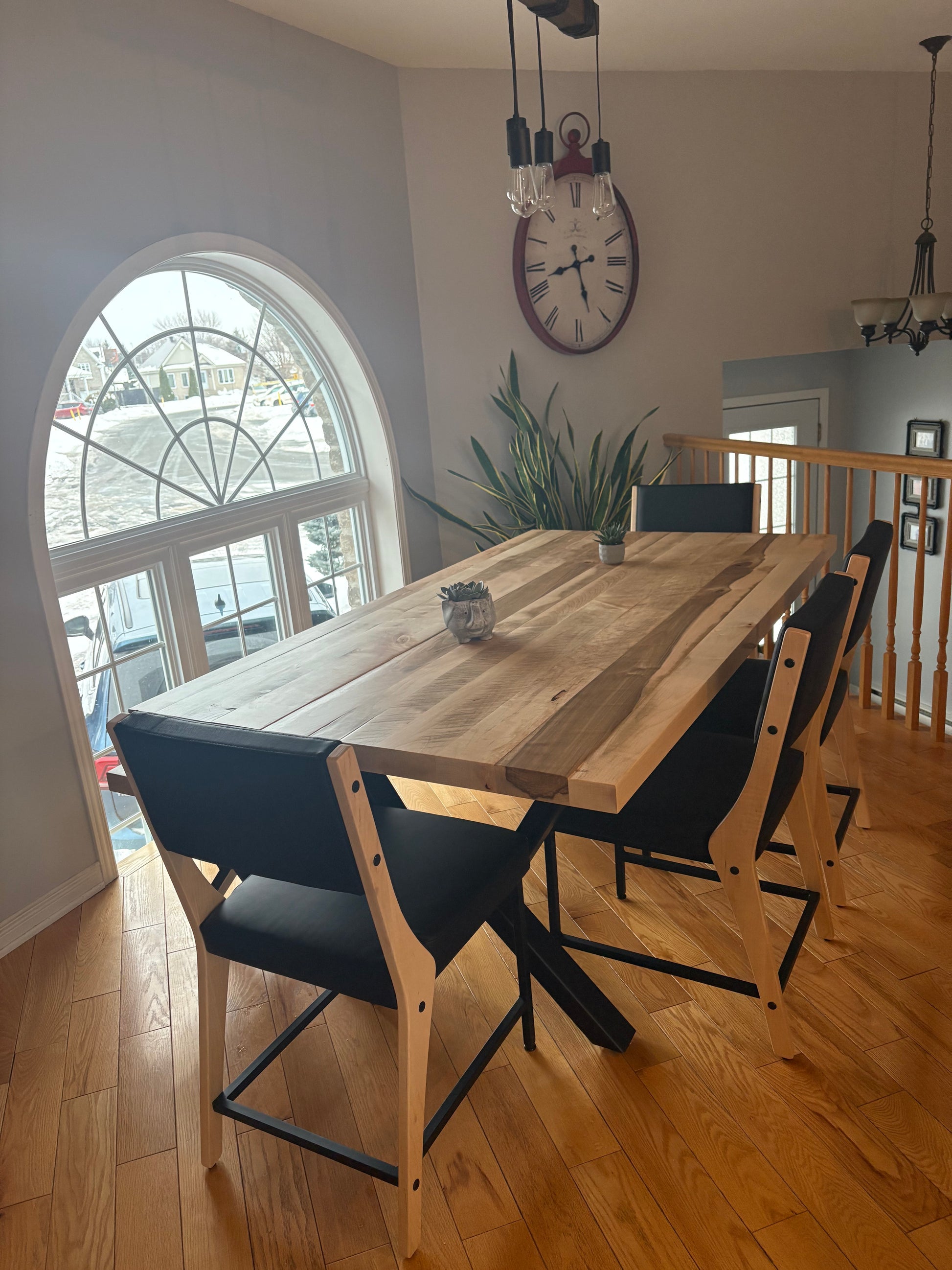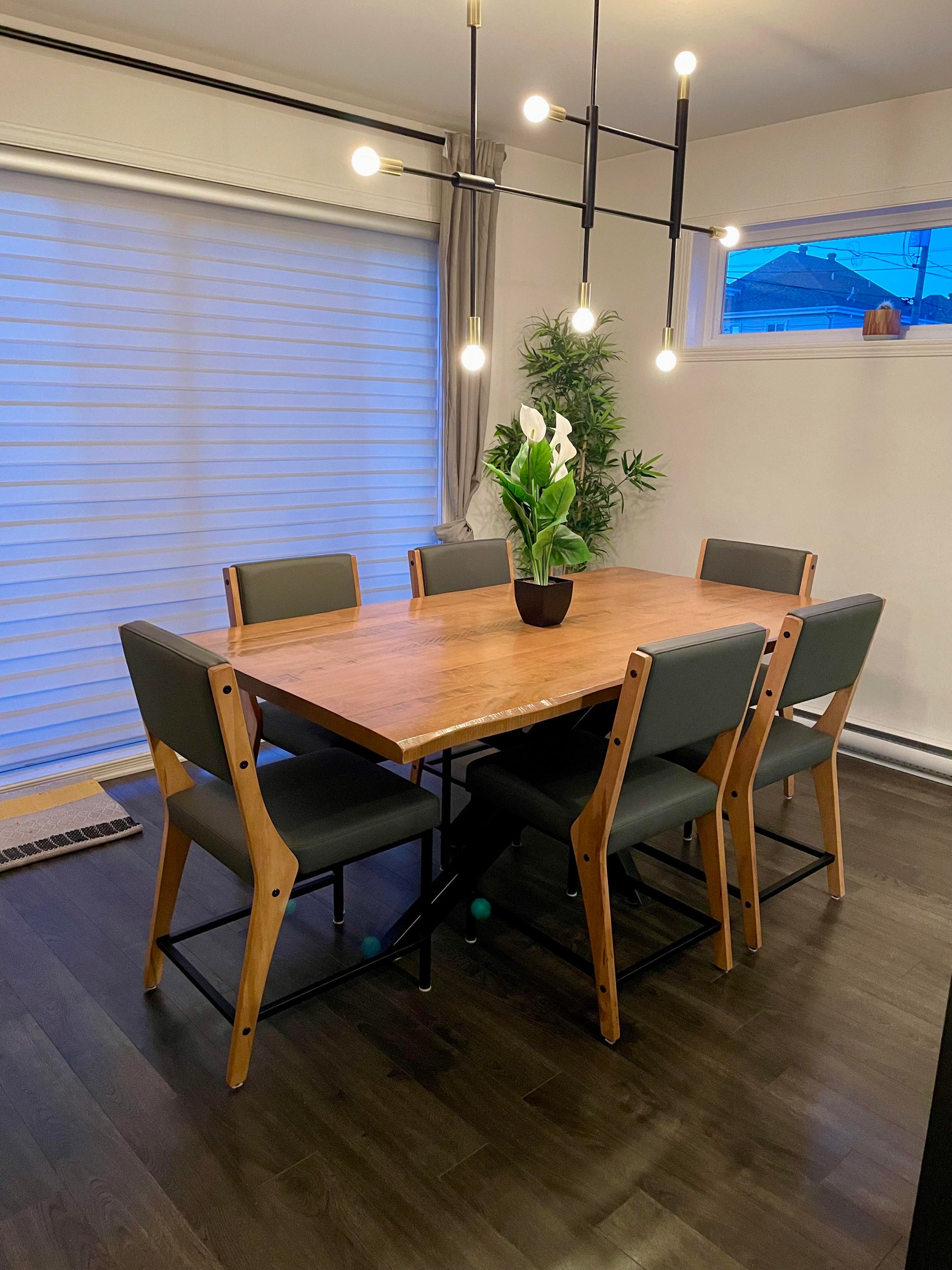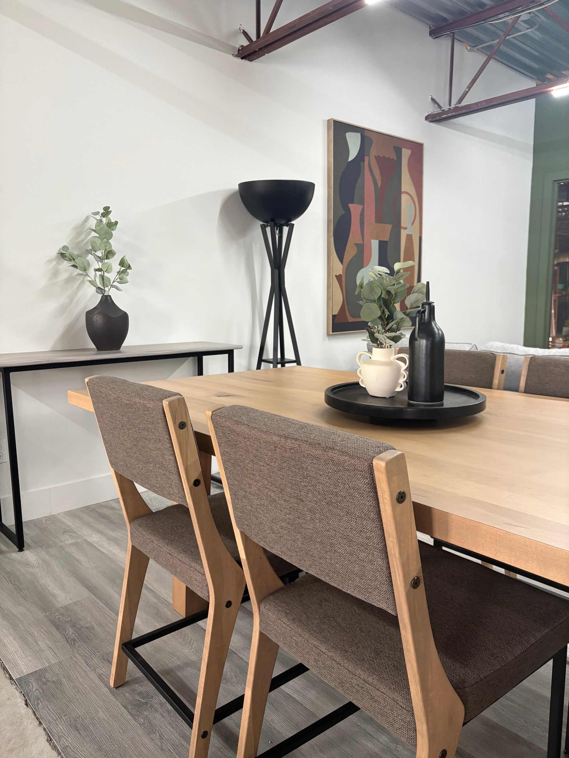 Après le grand succès de notre tabouret Victor, nous sommes fiers d'introduire le même modèle en format chaise pour la salle à manger. La parfaite alliance de bois, acier et rembourrage pour donner une douche moderne à votre décor.