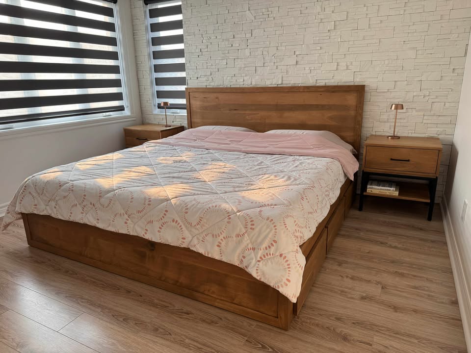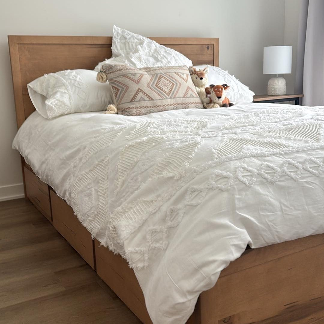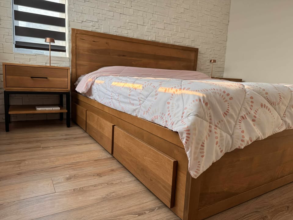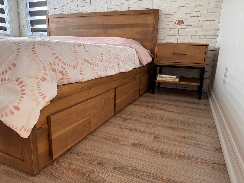 Notre lit Portneuf est offert avec l'option de tiroirs sous le lit. Le format simple comporte 3 tiroirs d'un côté (au choix), sinon, le lit a 6 tiroirs des deux côtés.