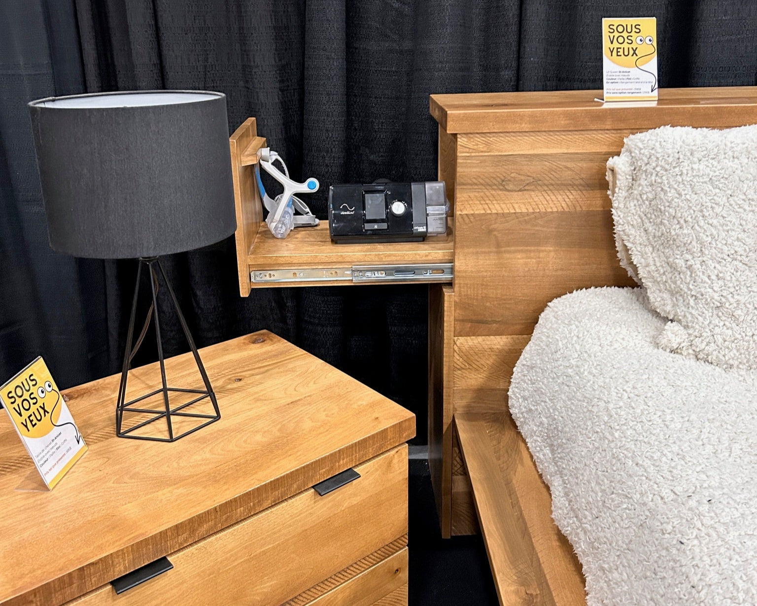 Une innovation signée Direct D'la Shop ! Il vous est maintenant possible de faire ajouter 2 tiroirs latéraux sur chaque côté de votre tête de lit pour y ranger votre machine CPAP. Des trous passe-fils seront alors machinés à l'arrière de la tête de lit pour camoufler le tout. Ni vu, ni connu !