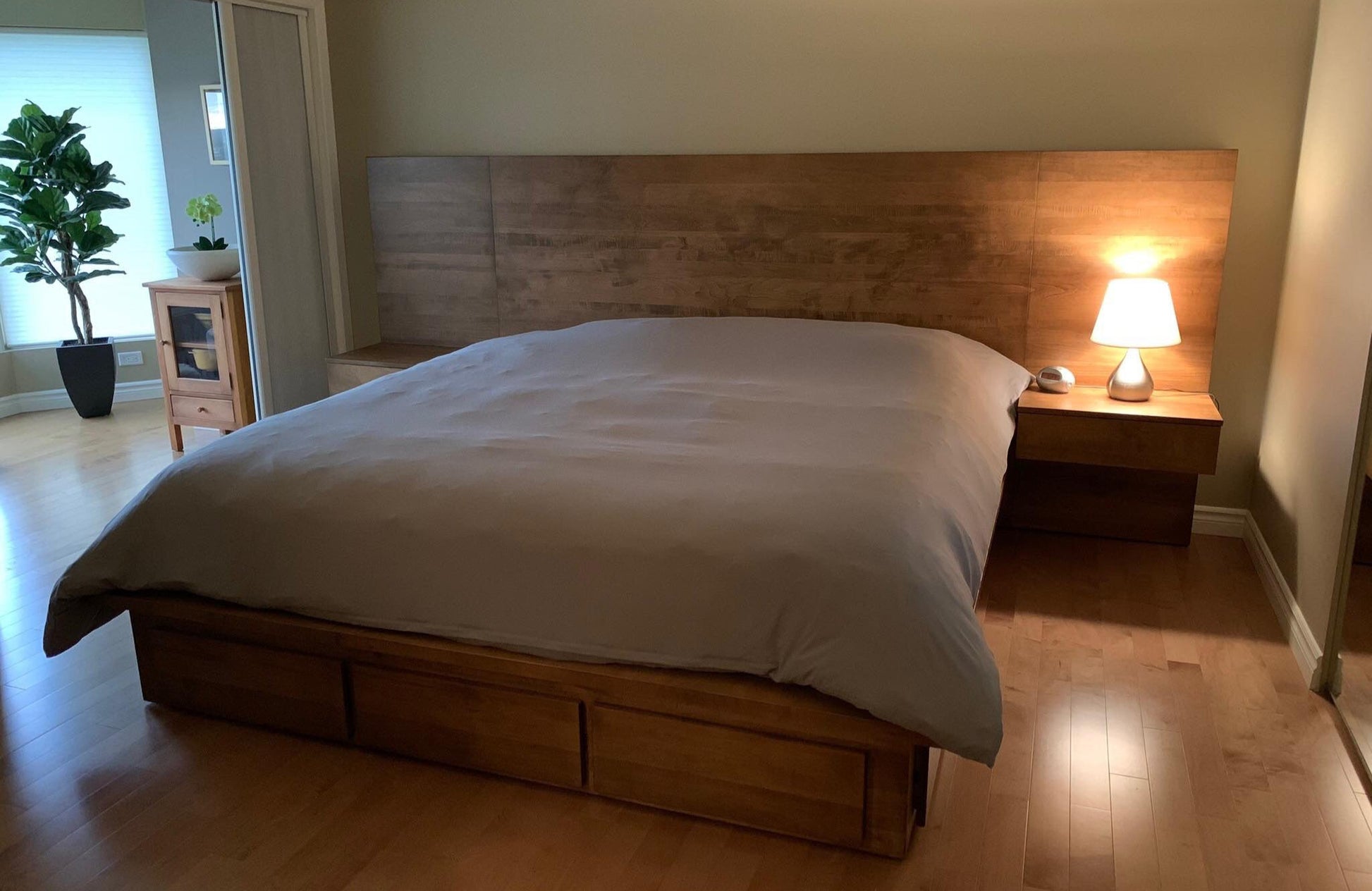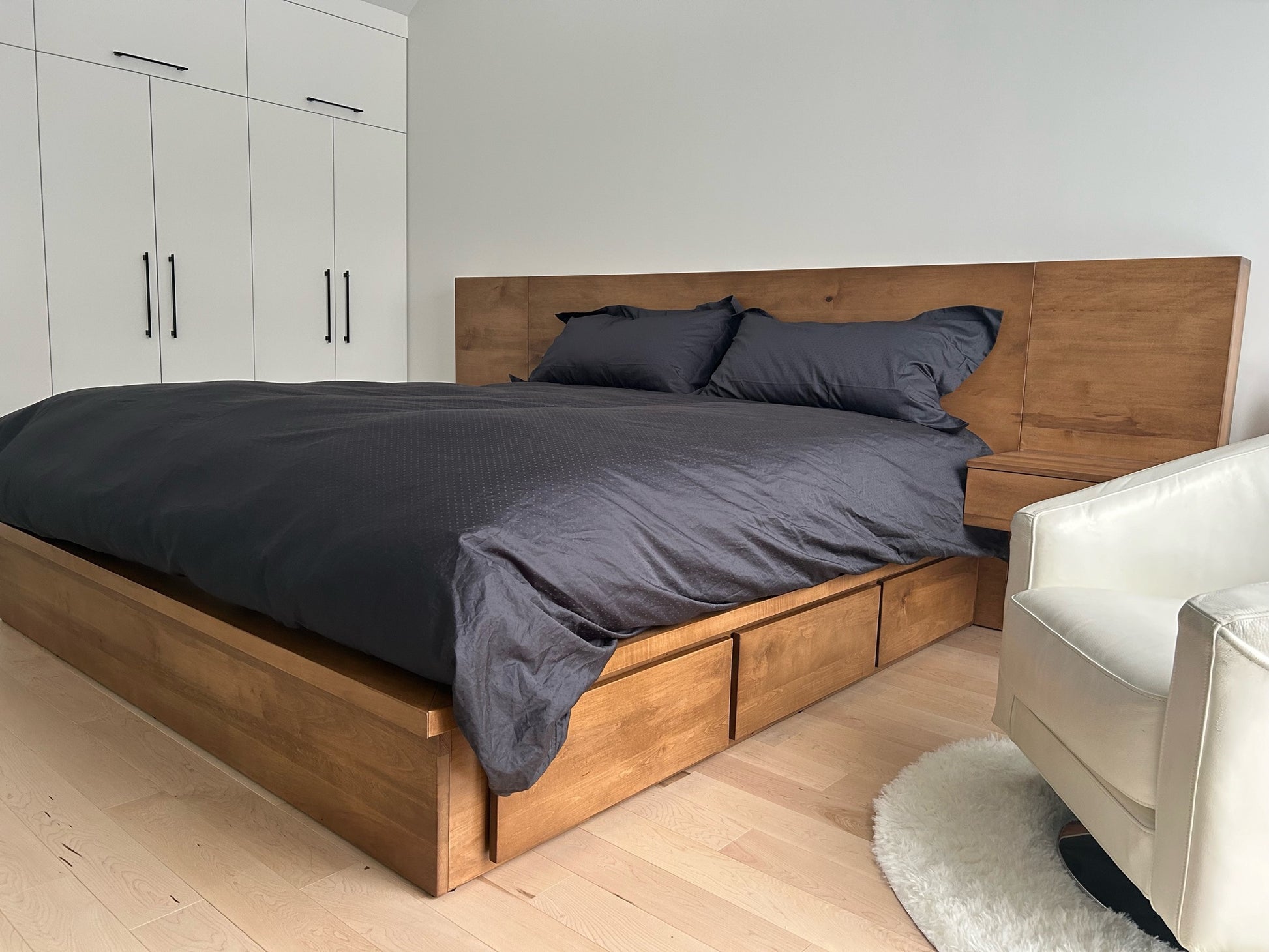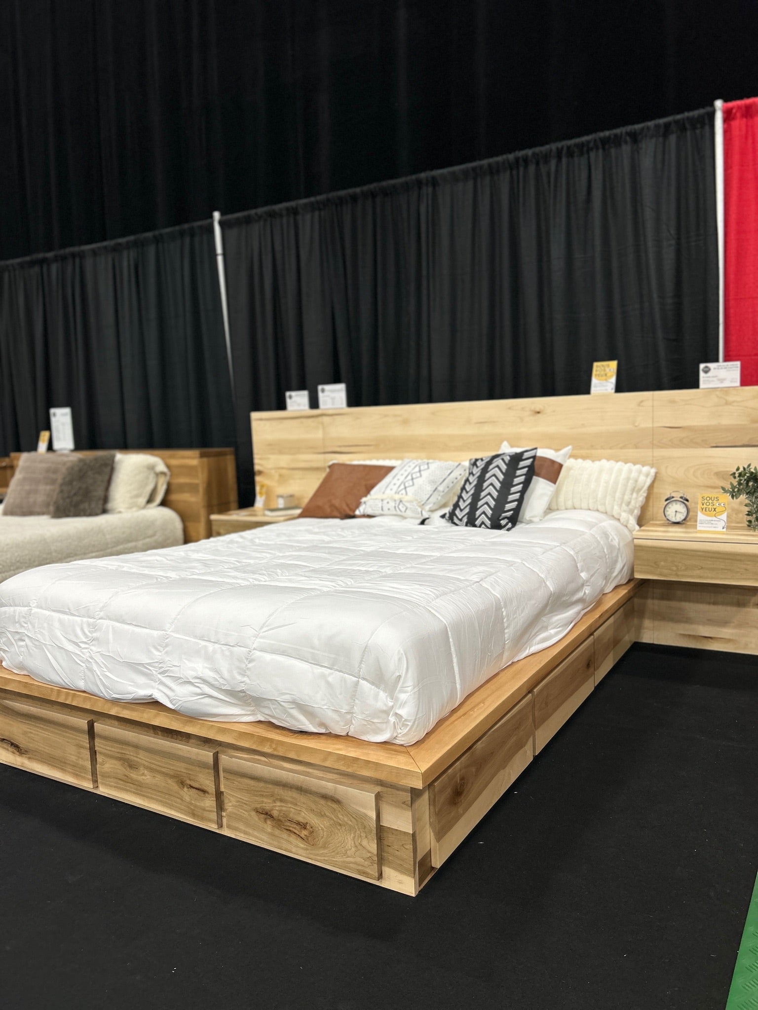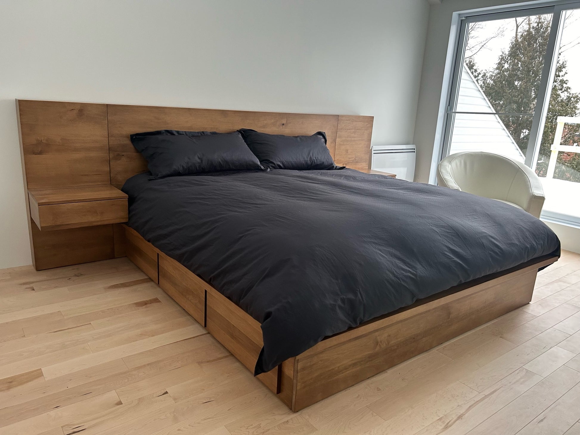 Le lit St-Élie-de-Caxton est disponible en deux formats standards (Queen ou King) et peut être fabriqué avec ou sans rangement sous le lit (6 tiroirs). Les tables de chevet sont optionnelles et sont vendues séparément du lit.