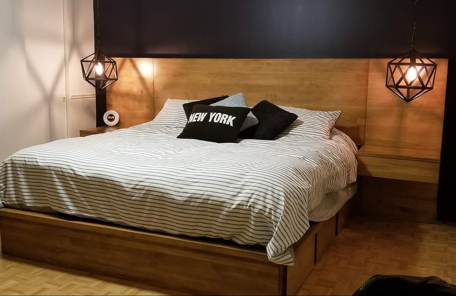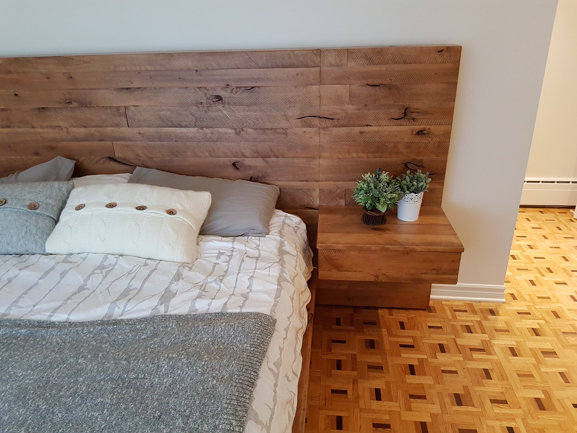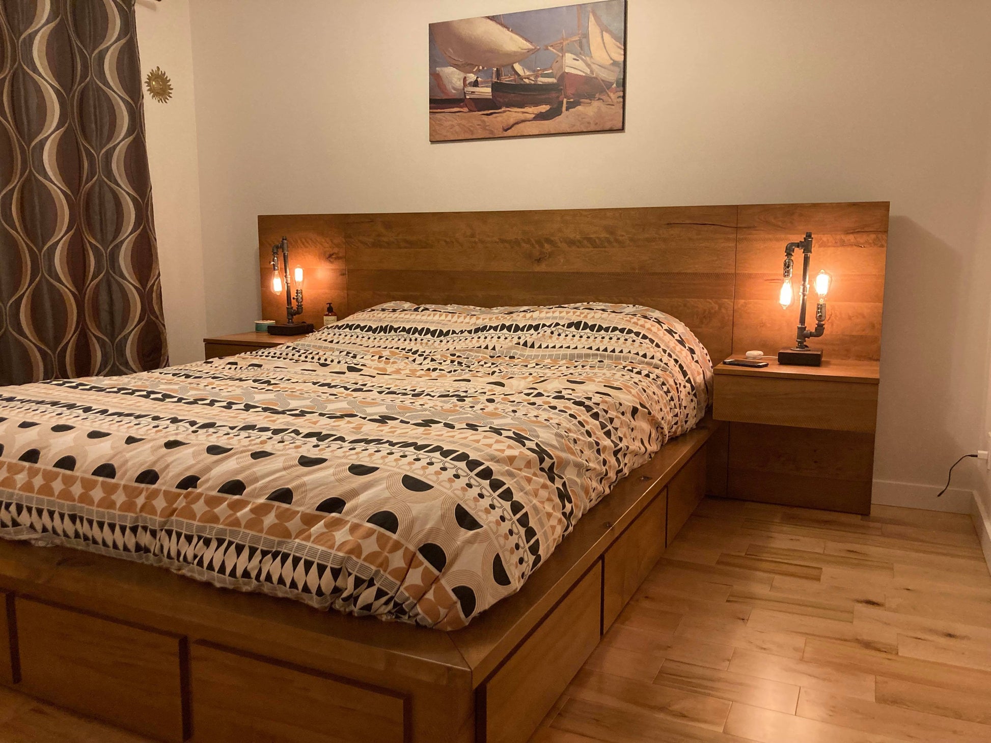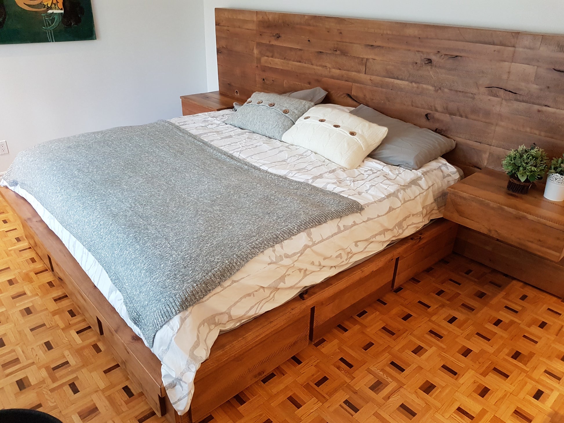 Le lit St-Élie-de-Caxton est disponible en deux formats standards (Queen ou King) et peut être fabriqué avec ou sans rangement sous le lit (6 tiroirs). Les tables de chevet sont optionnelles et sont vendues séparément du lit.