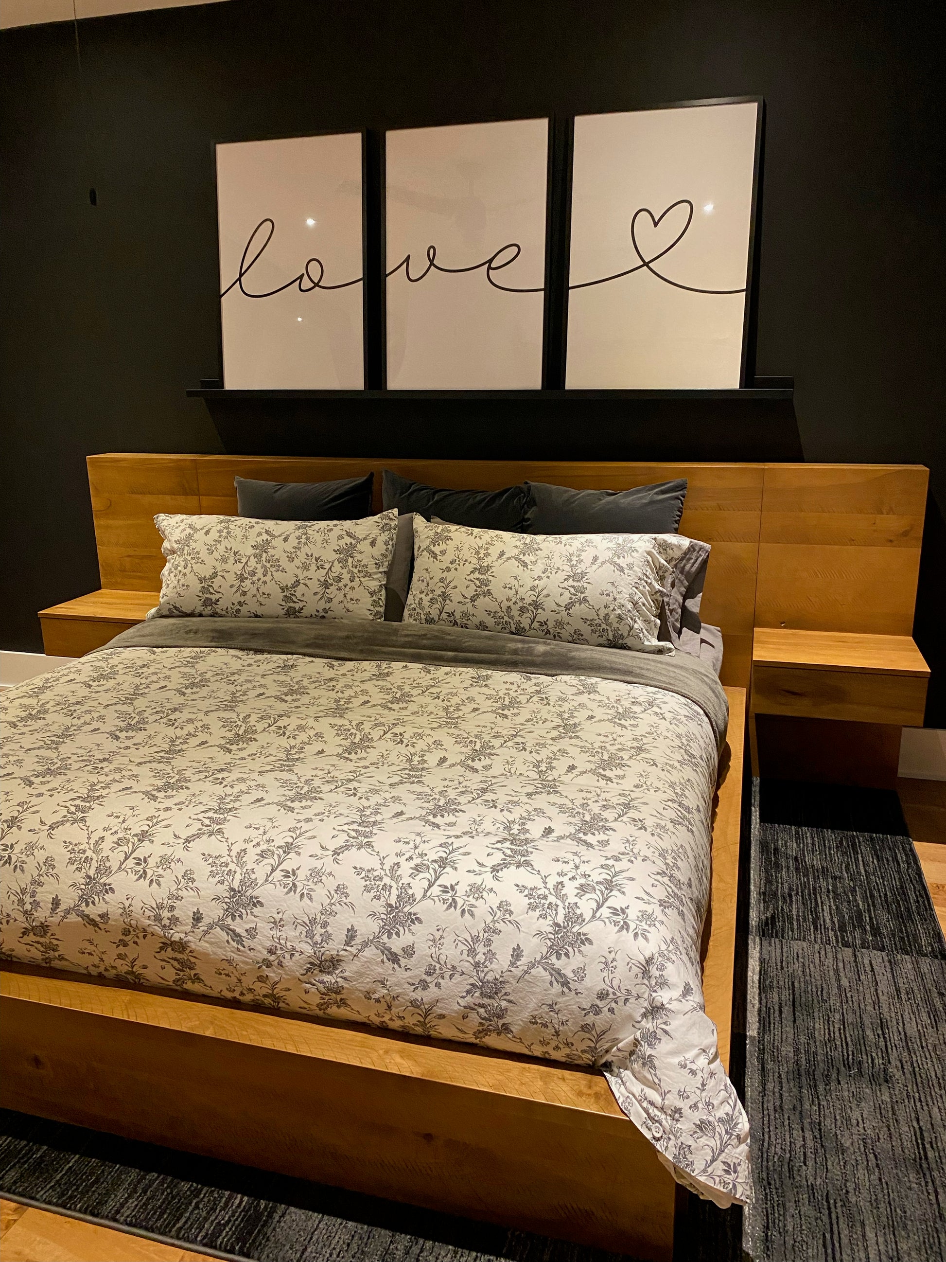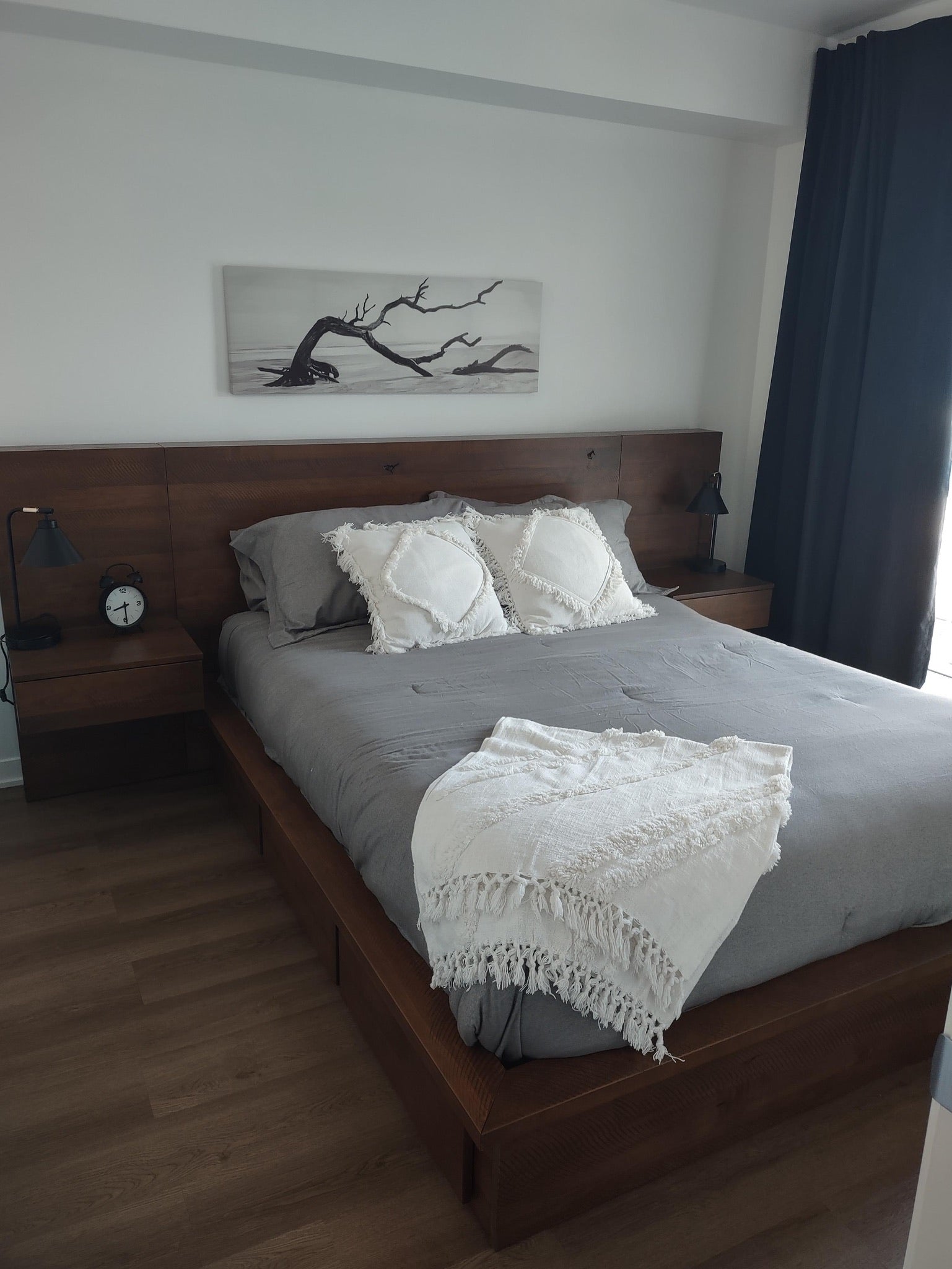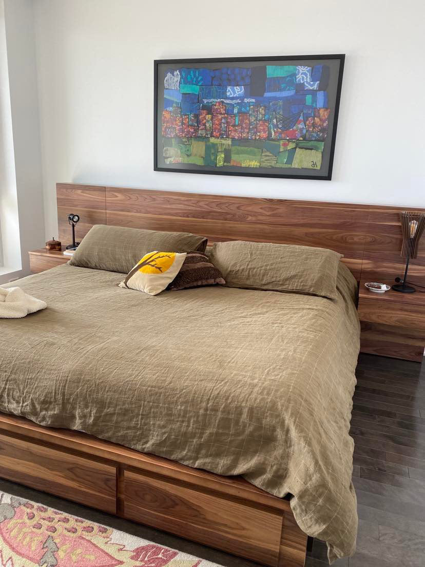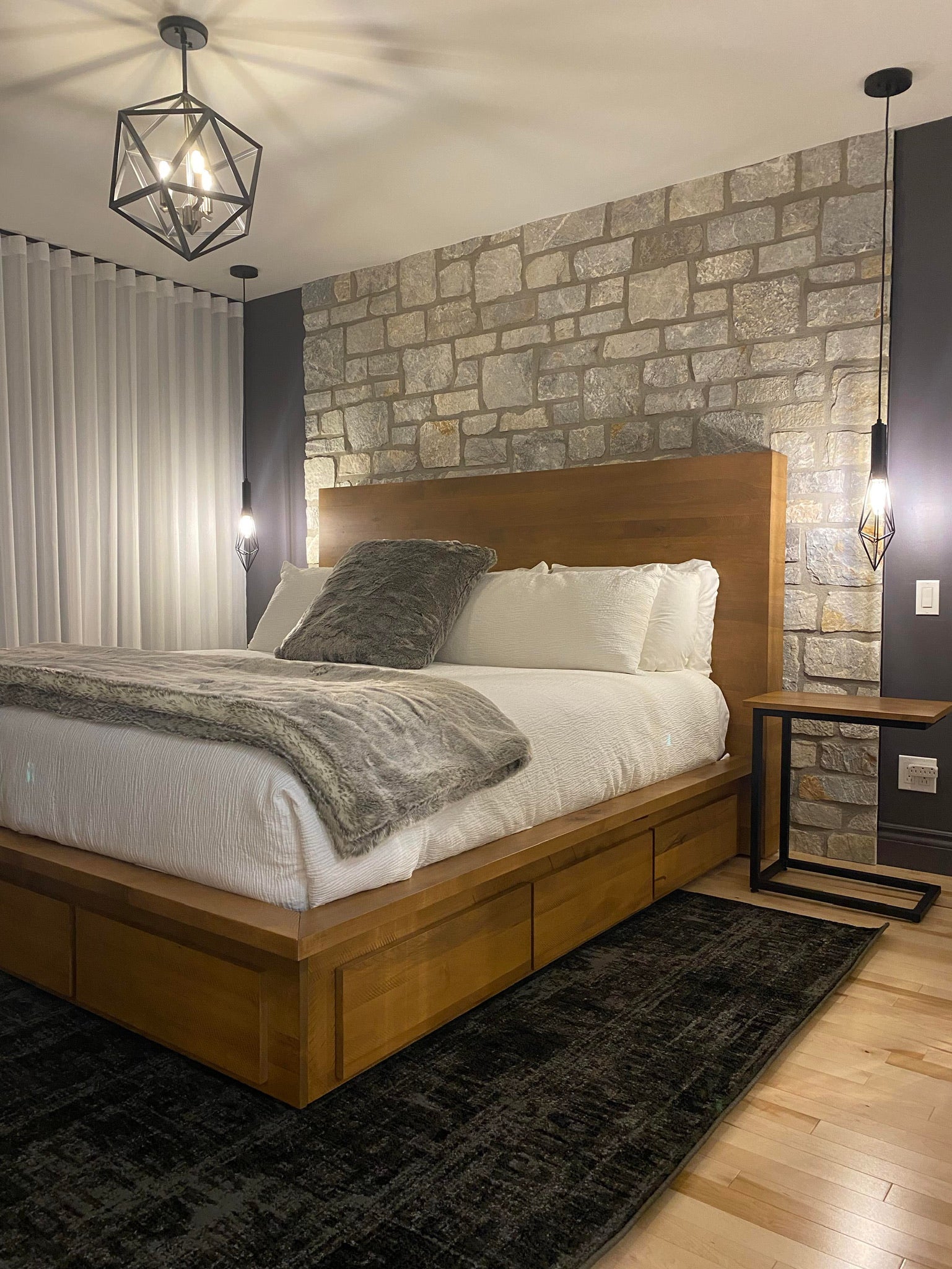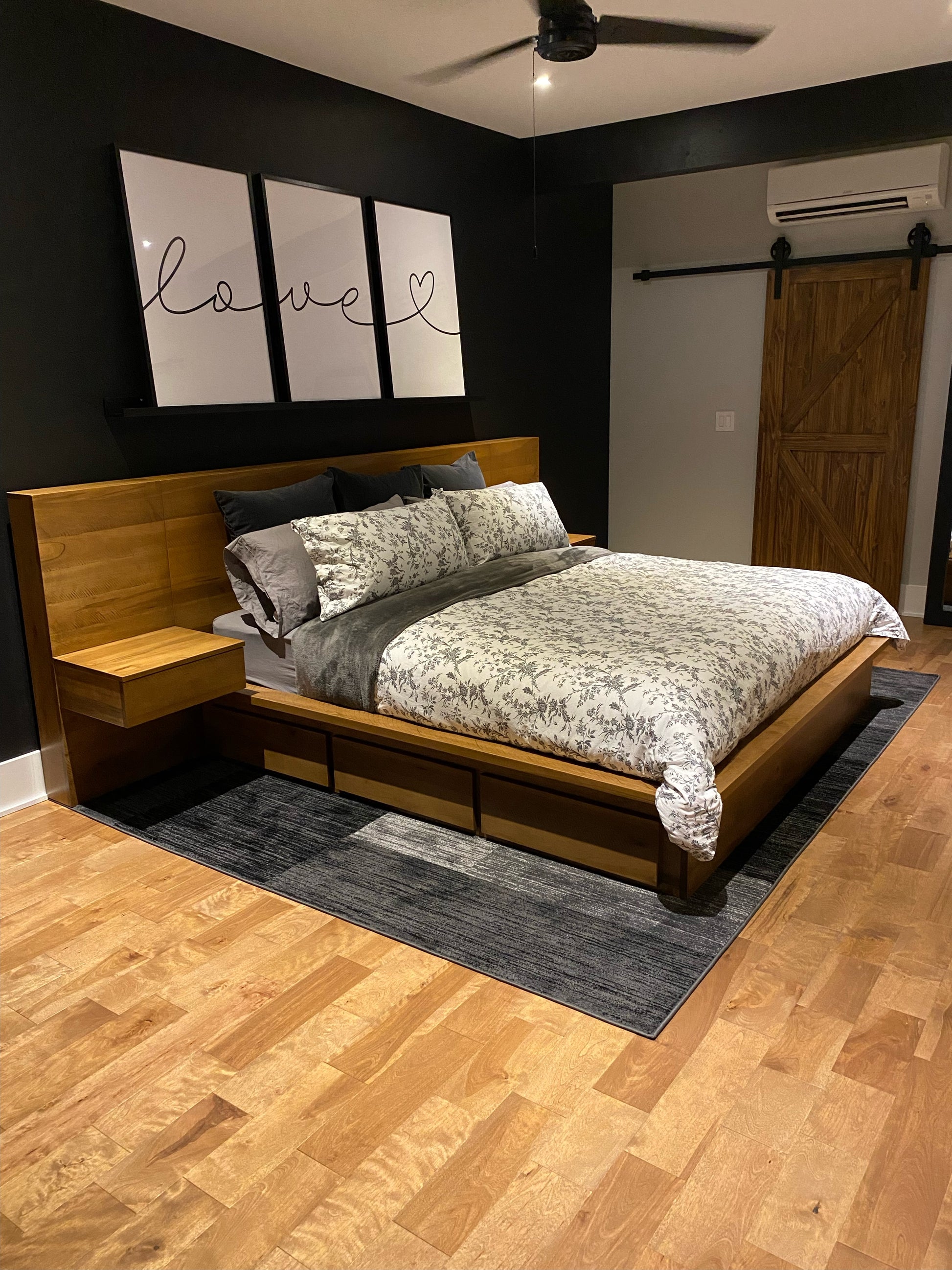 Le lit St-Élie-de-Caxton est disponible en deux formats standards (Queen ou King) et peut être fabriqué avec ou sans rangement sous le lit (6 tiroirs). Les tables de chevet sont optionnelles et sont vendues séparément du lit.