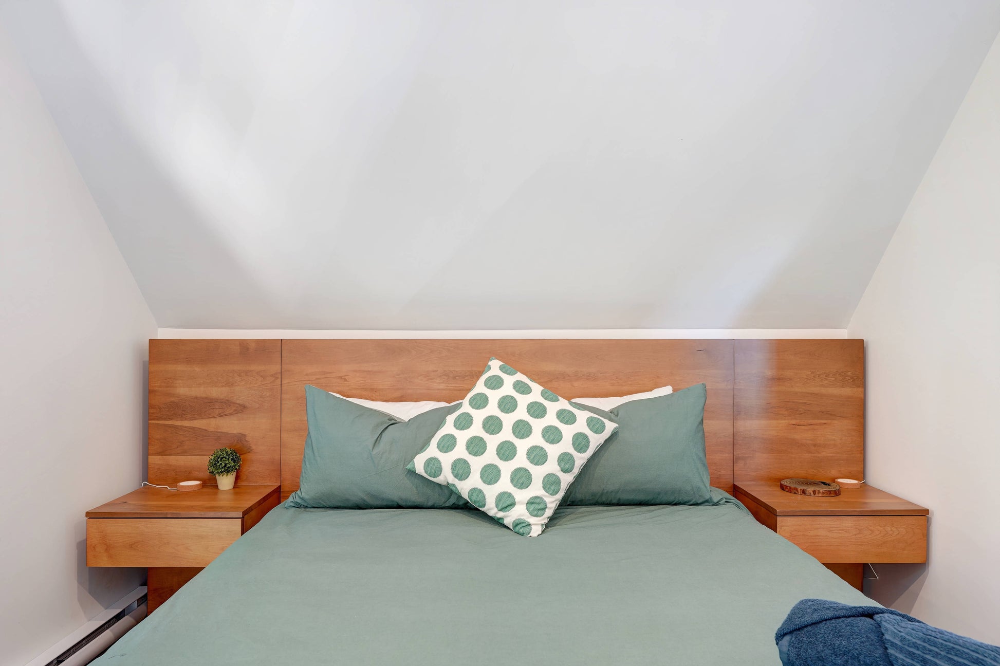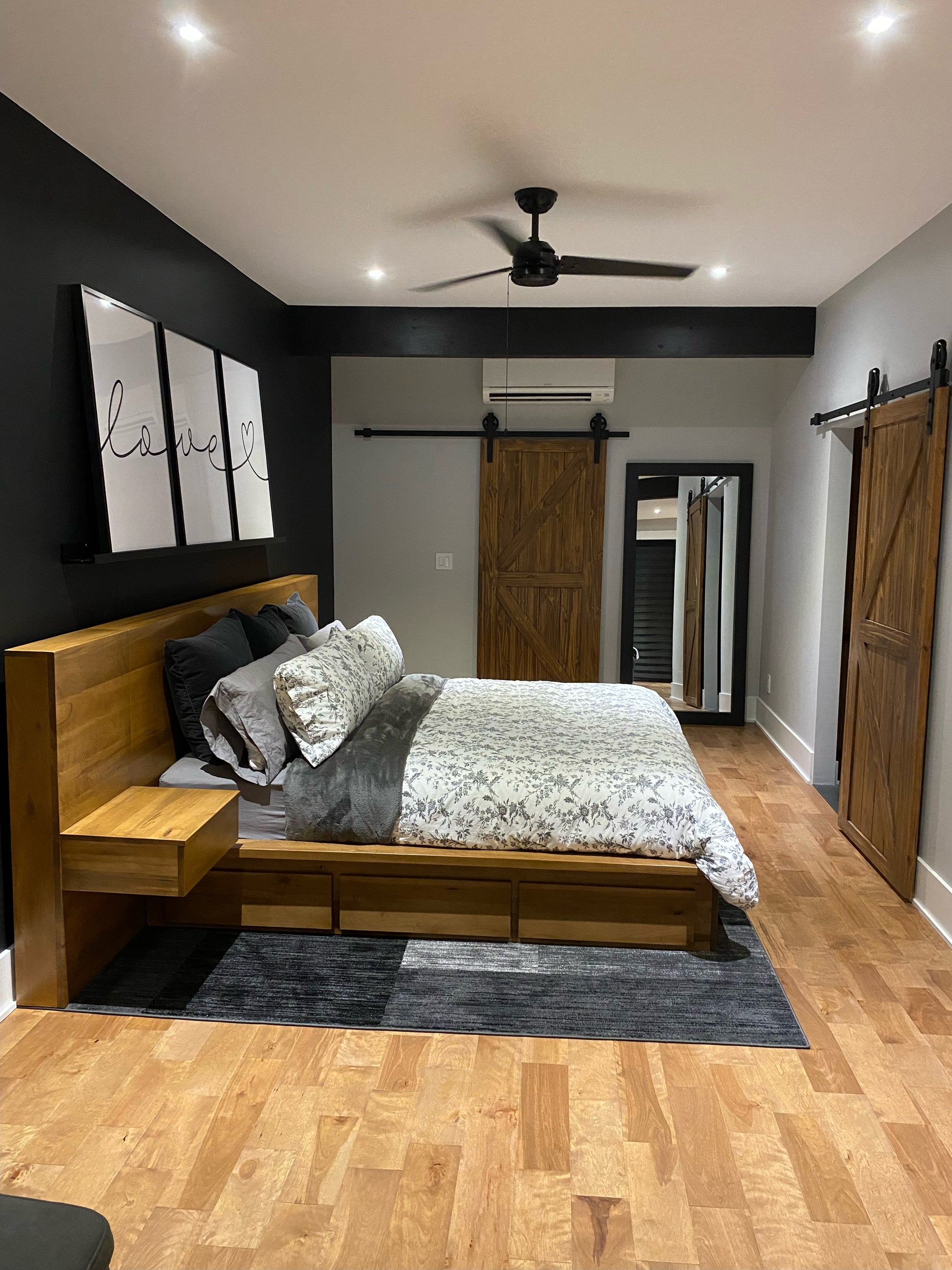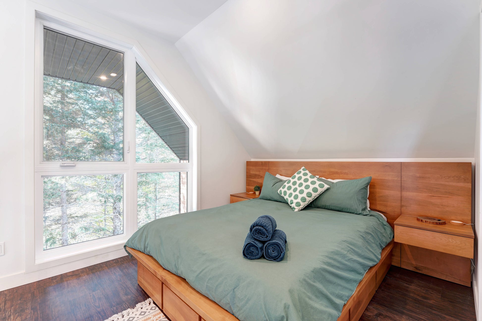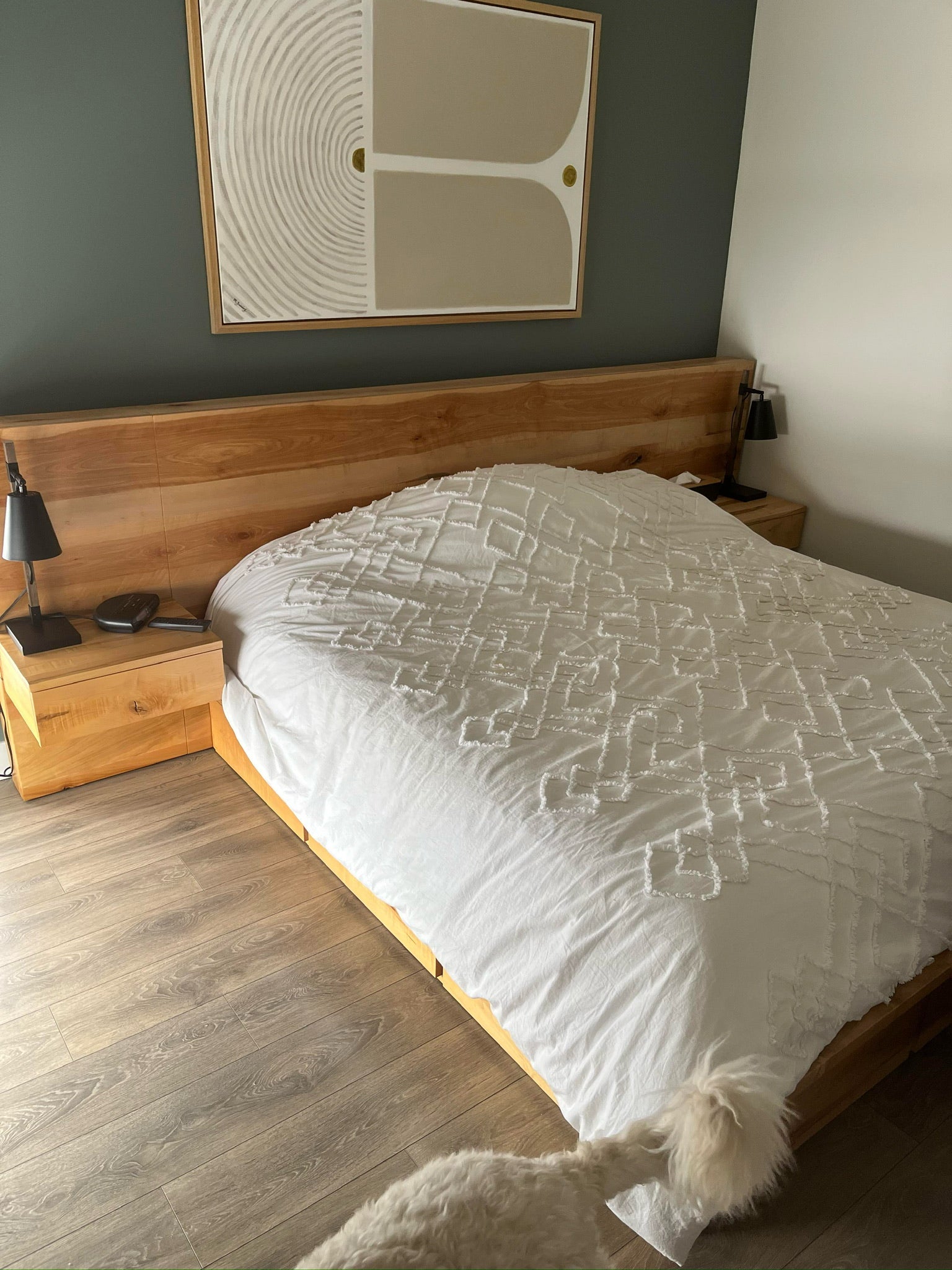 Le lit St-Élie-de-Caxton est disponible en deux formats standards (Queen ou King) et peut être fabriqué avec ou sans rangement sous le lit (6 tiroirs). Les tables de chevet sont optionnelles et sont vendues séparément du lit.