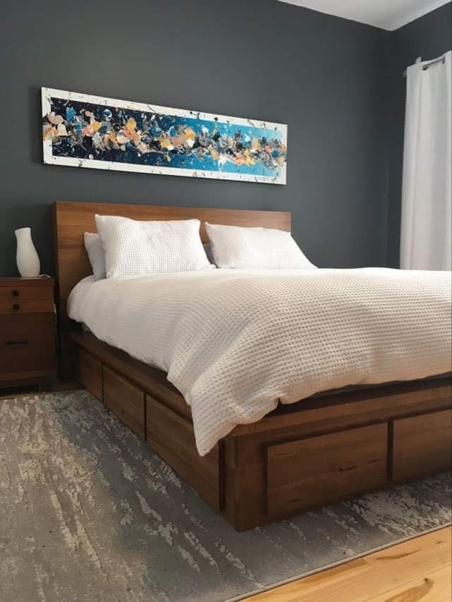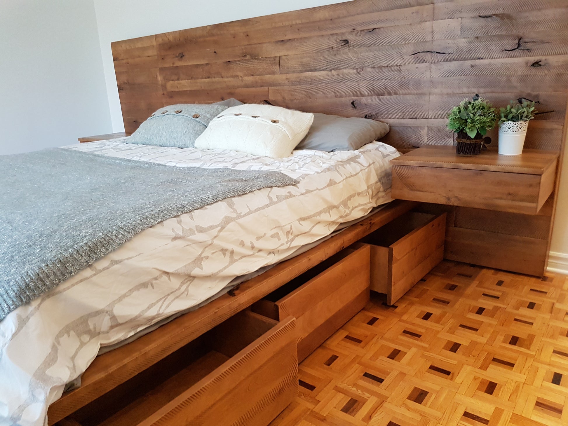 Notre lit St-Élie-de-Caxton est offert avec l'option d'avoir 6 tiroirs sous le lit (à gauche et à droite).