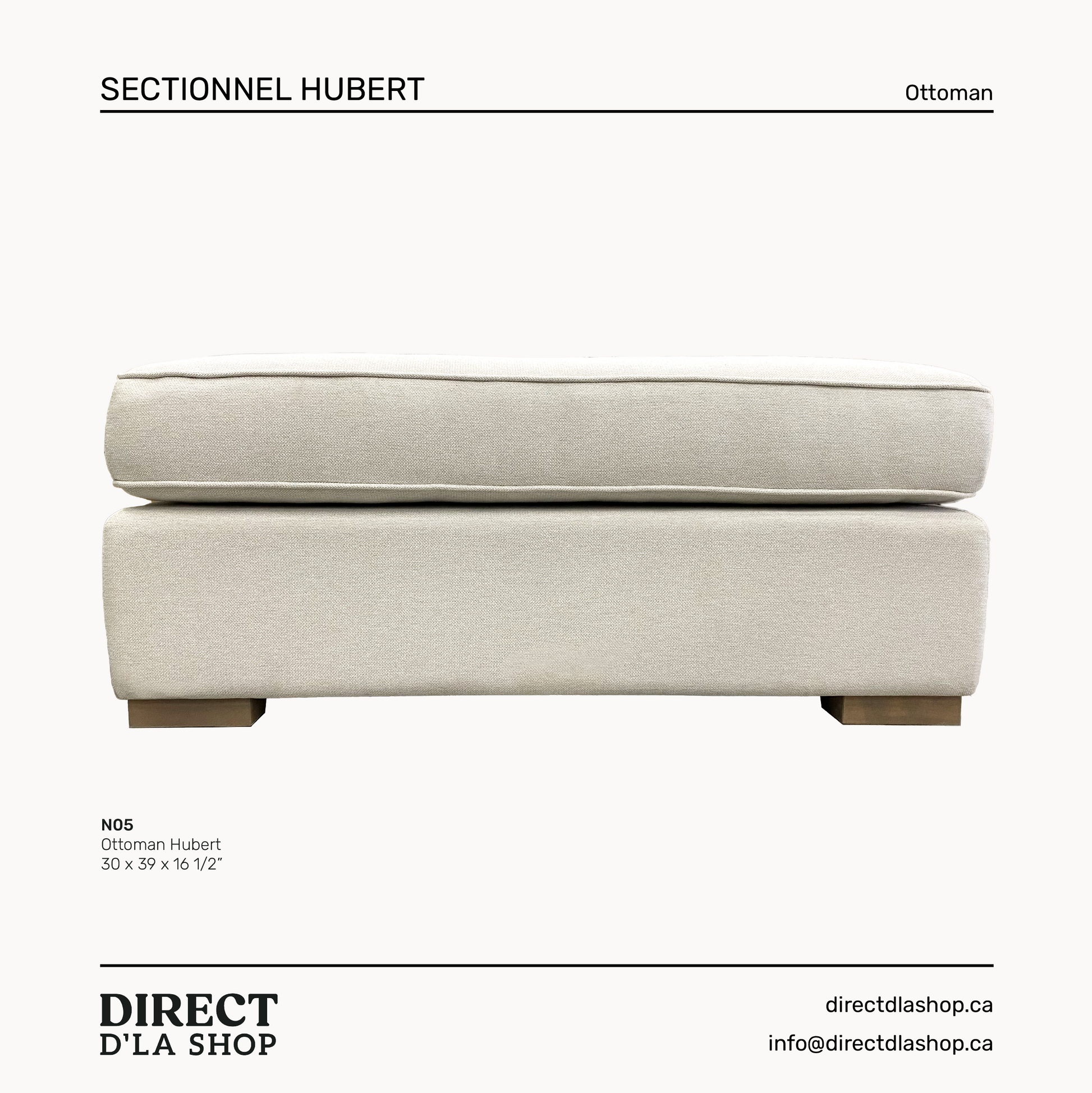 Les pattes de l'ottoman sont en ÉRABLE MASSIF. Une vingtaine de choix de couleurs s'offrent à vous pour les pattes. Voir les différentes teintes offertes.