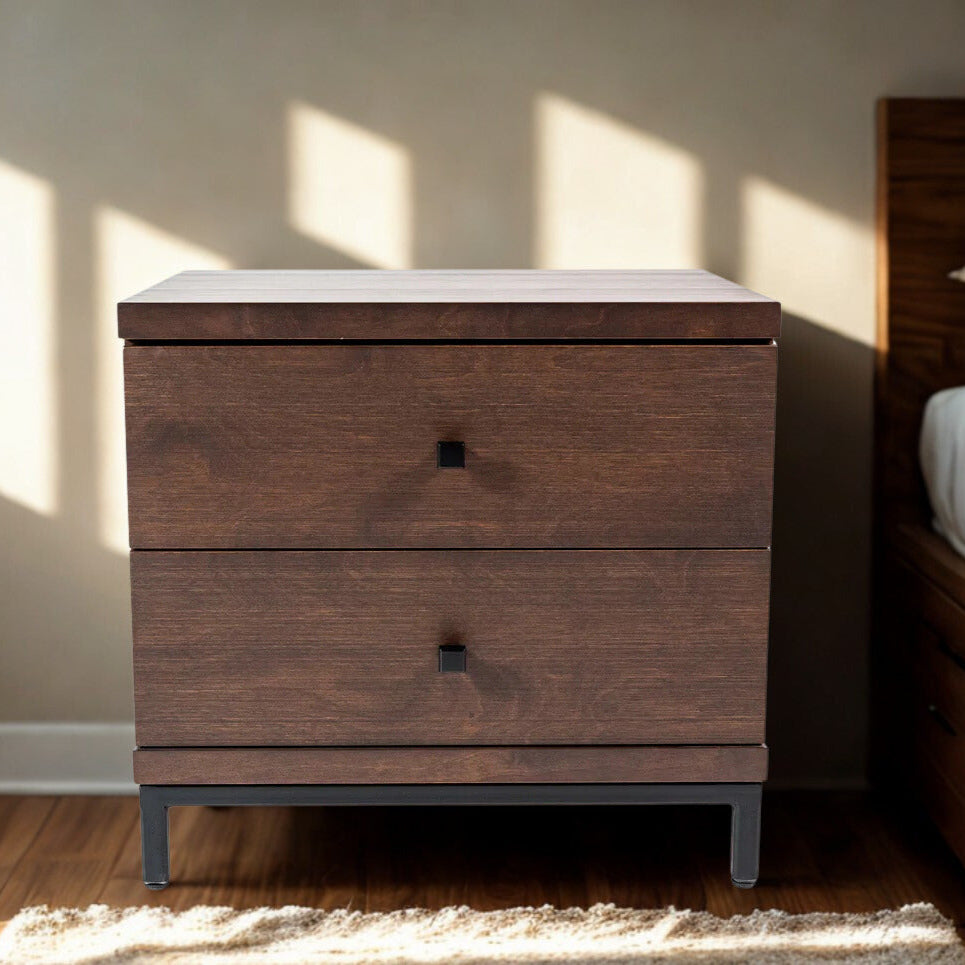 La table de chevet Fort Rupert peut être fabriquée entièrement en BOIS MASSIF (au choix : érable ou noyer) ou en PLACAGE DE BOIS (noyer, merisier ou chêne). Les pattes du meuble sont en ACIER.
