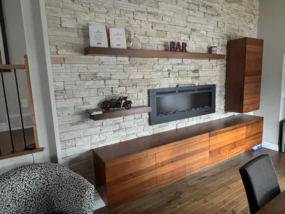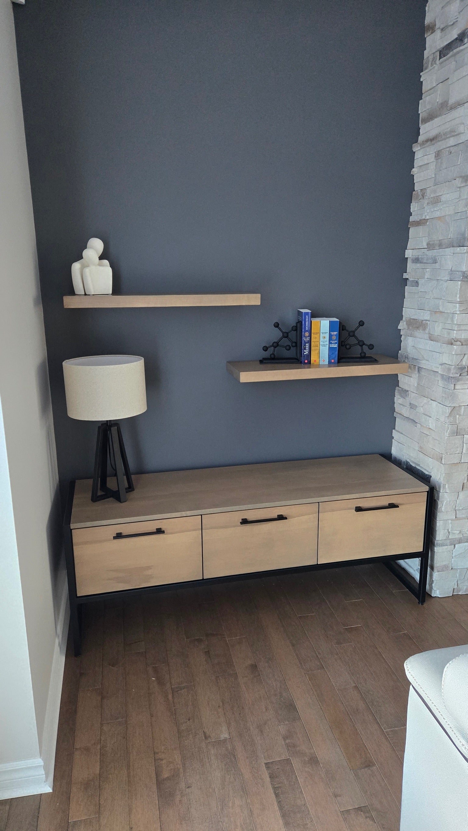 Les tablettes flottantes sont faites en BOIS MASSIF (au choix : érable ou noyer).